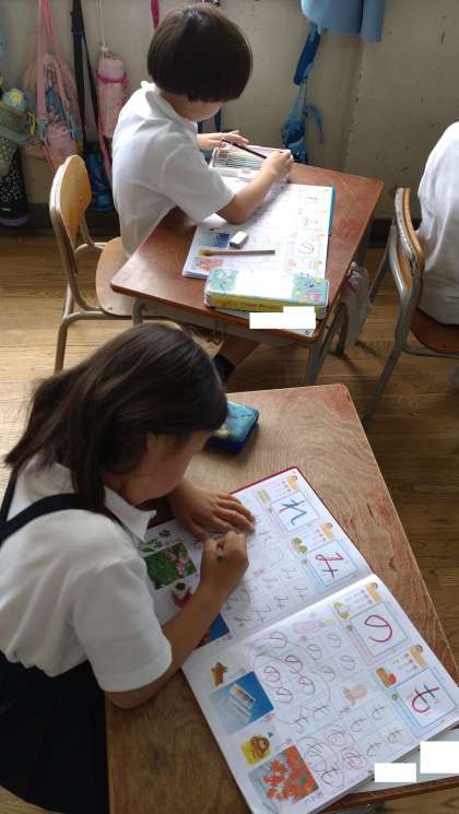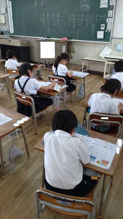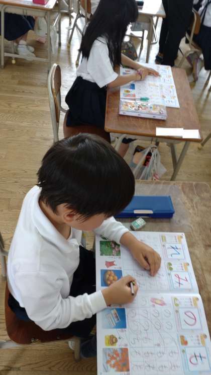 1年生がひらがなの学習に取り組んでいます。この時間は、「み」と「れ」のひらがなを学んでいます。子どもたちは、とても集中して丁寧に書いています。