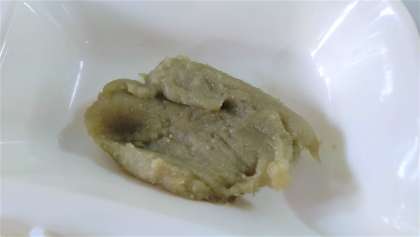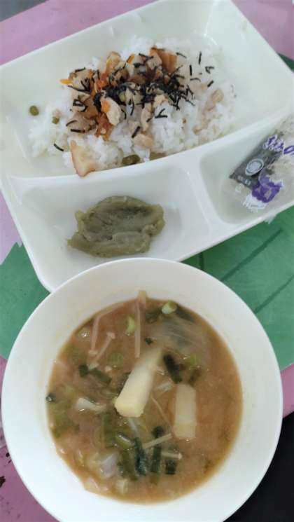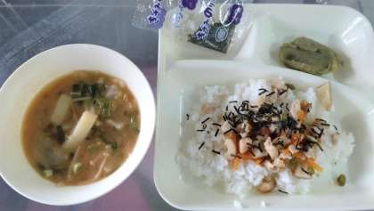今日の給食は、かやくご飯、みそ汁、まっ茶ういろう、牛乳です。