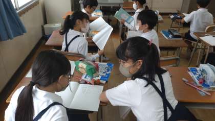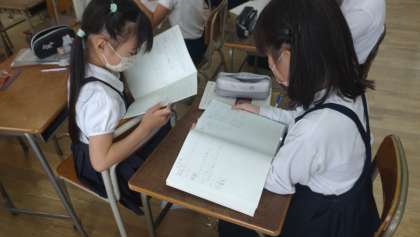 考える段階では、ペアで意見を交流したり、考えた説明を発表したりします。写真は、ペアで話し合う様子です。