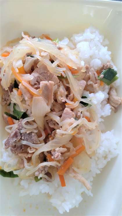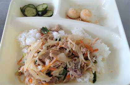 今日の給食は、豚丼、きゅうりの梅風味、白玉だんごのきな粉かけ、牛乳です。