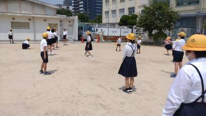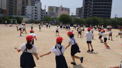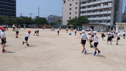 写真は、休み時間に遊んでいる子どもたちの様子です。ドッジボールやだるまさんがころんだなど、いろいろな遊びで楽しんでいます。広い運動場いっぱいに広がって、子どもたちは元気とても元気です。