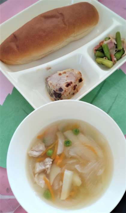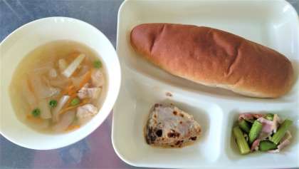 今日の給食は、かつおのマリネ焼き(ノンエッグドレッシング)、スープ、グリーンアスパラガスのソテー、黒糖パン、牛乳です。