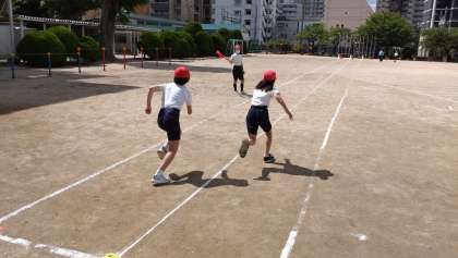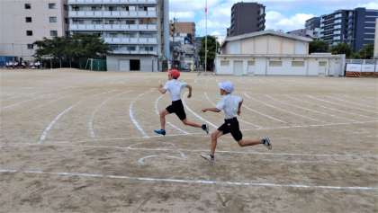 昨日から始まった新体力テスト、今日も1限目から、5年生が50m走の測定に取り組んでいます。
