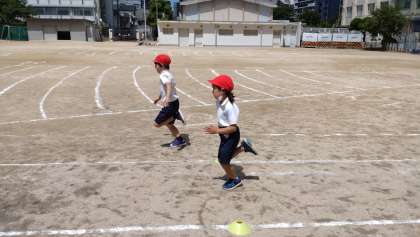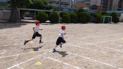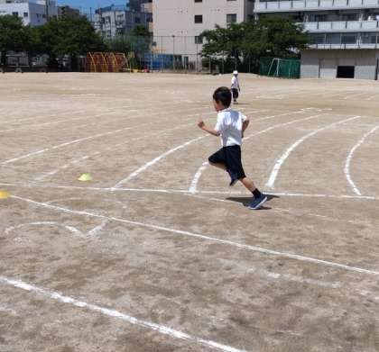 5年生に続き、1年生も50m走の測定に取り組んでいます。子どもたちは、一生懸命に走っています。