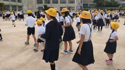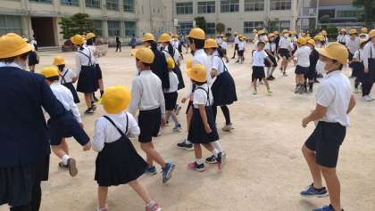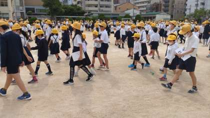 写真は、ゲーム終了後、6年生が1年生をリードして教室に向かって様子です。