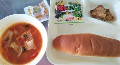 今日の給食は、一口トンカツ、ミネストローネ、豆こんぶ、コッペパン、アプリコットジャム、牛乳です。