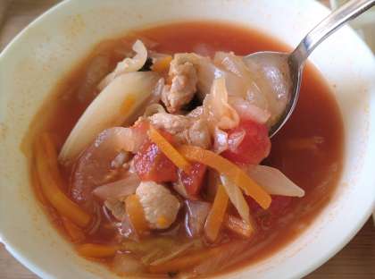 今日の給食では、鶏肉とキャベツ、たまねぎ、トマトなどの野菜が使われています。