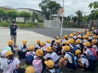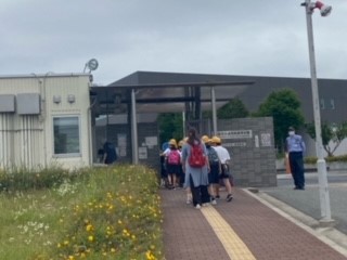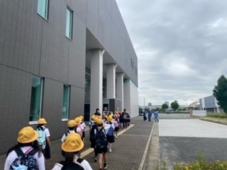 本日、4年生の社会見学で柴島浄水場に出発しました。9時過ぎに、無事に浄水場に到着しました。写真は、到着後、係の方からの説明を聞いている子どもたちの様子です。