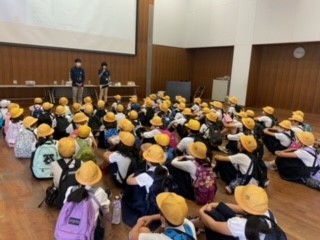 浄水場内に入り、子どもたちは、見学についての説明を聞いています。