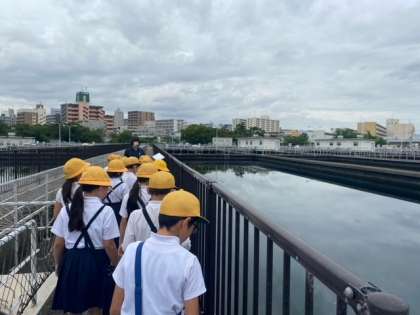 浄水場内のいろいろな施設を見学しています。
