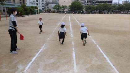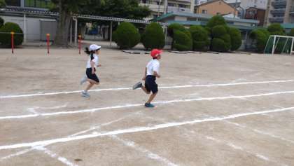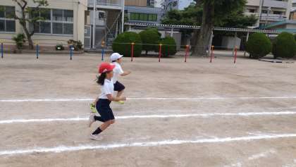 学校では、2年生が50m走に取り組んでいました。子どもたちは、全力疾走です。