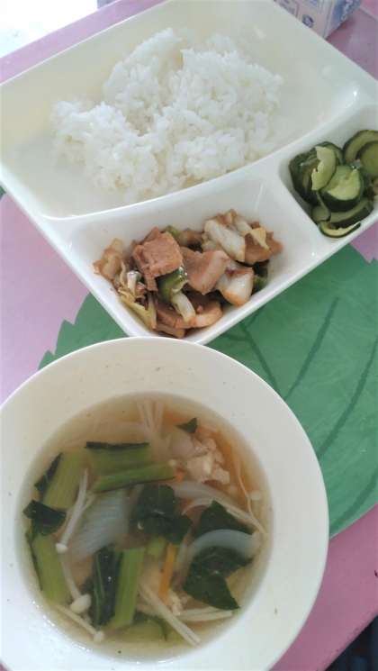今日の給食は、ホイコウロー、中華スープ、きゅうりのピリ辛あえ、ごはん、牛乳です。