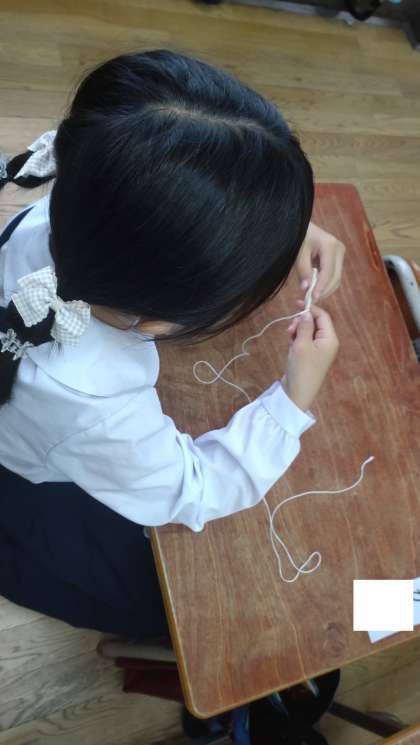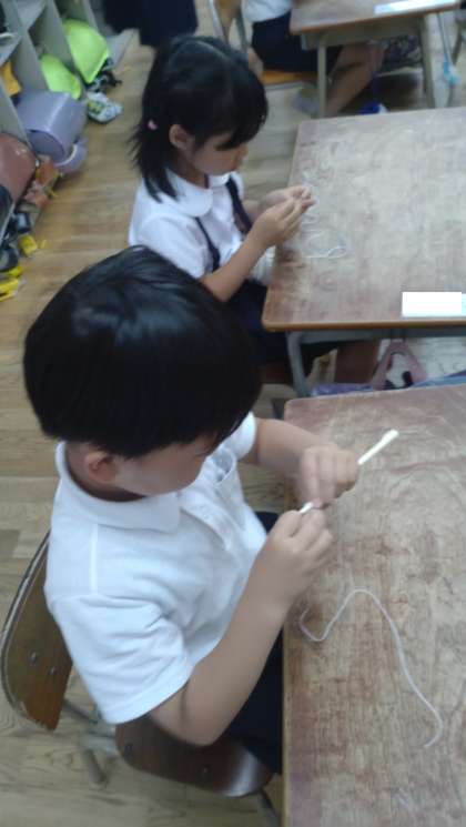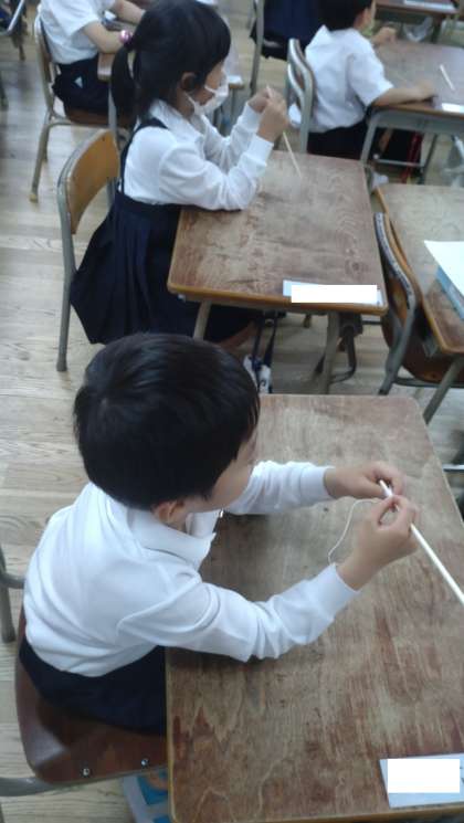 1年生が木川カーニバルに向けて、お店の準備に取り組みました。お店で使う釣りざおを一生懸命に作っています。