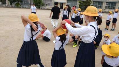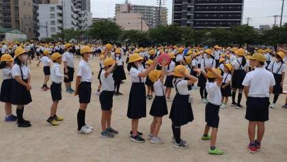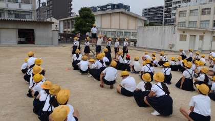 今朝、児童集会がありました。集会委員会の司会・進行で、ゲームを楽しみました。写真は、集会委員会が見本を見せて、たてわり班対抗で子どもたちがボール送りゲームをしている様子です。