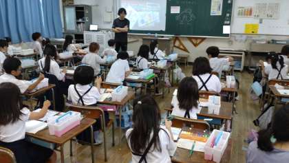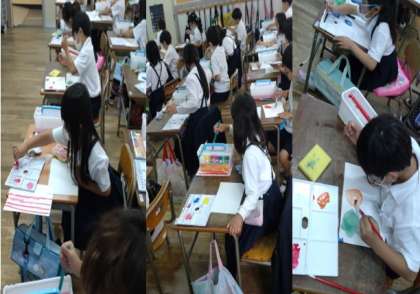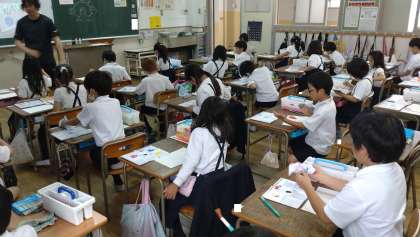 2年生が図画工作で、「かきごおり」の描画に取り組みました。はじめは、水彩絵の具の使い方や色の作り方などの基本から学んでいます。
