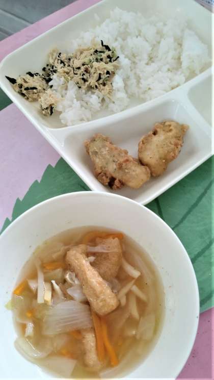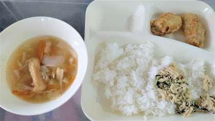 今日の給食は、白身魚のフリッター、すまし汁、とりなっ葉いため、ごはん、牛乳です。
