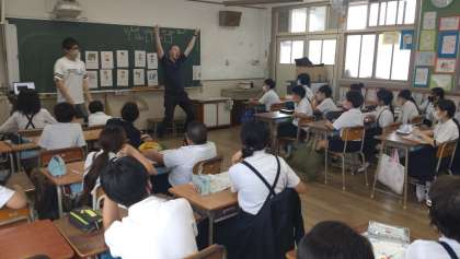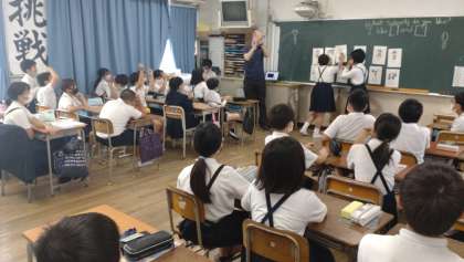 5年生の外国語で、C-NETの先生とWhat subjects do you like? I like ...and ....の基本表現を使って英語活動をしました。下段の2枚の写真は、クラスで2チームに分かれて、好きな教科について具体的な情報を聞き取るゲームをしている様子です。