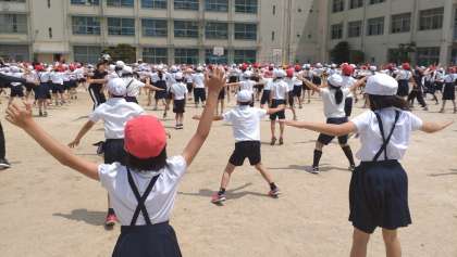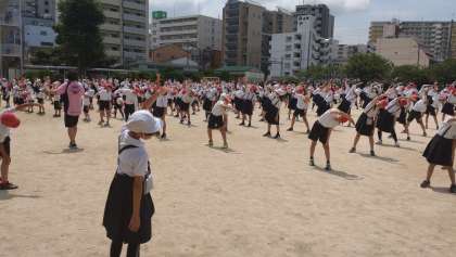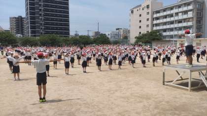 本日、15分休みの時間に全校でのラジオ体操が行なわれました。梅雨の間の晴れ間でしたが、運動委員会の子どもたちの体操をお手本に、子どもたちは体を大きく使って体操をすることができていました。