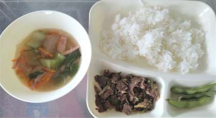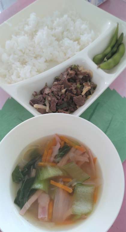今日の給食は、チンジャオニューロウスー、ハムと野菜の中華スープ、えだまめ、ごはん、牛乳です。
