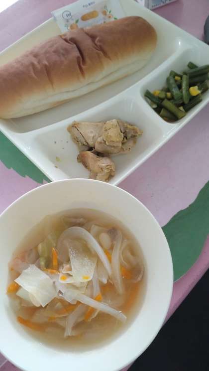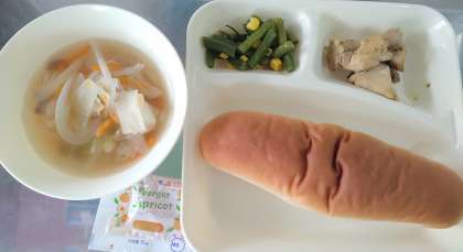 今日の給食は、鶏肉のカレー風味焼き、てぼ豆のスープ、さんどまめとコーンのサラダ、コッペパン、アプリコットジャム、牛乳です。