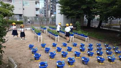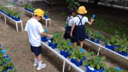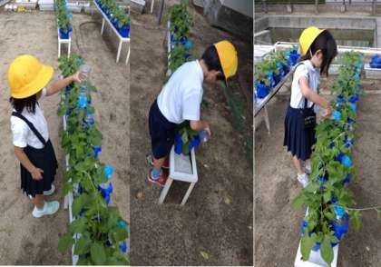 1年生の子どもたちが、毎朝、熱心にアサガオの水やりをしています。花が咲くのが楽しみですね。
