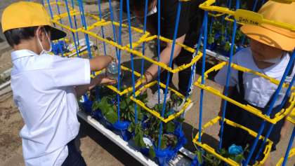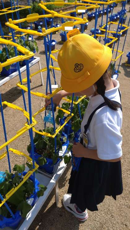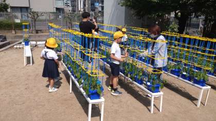 アサガオのつるが伸びてきたので、支柱をたてました。子どもたちの毎日の水やりで、どのアサガオも元気に育っています。