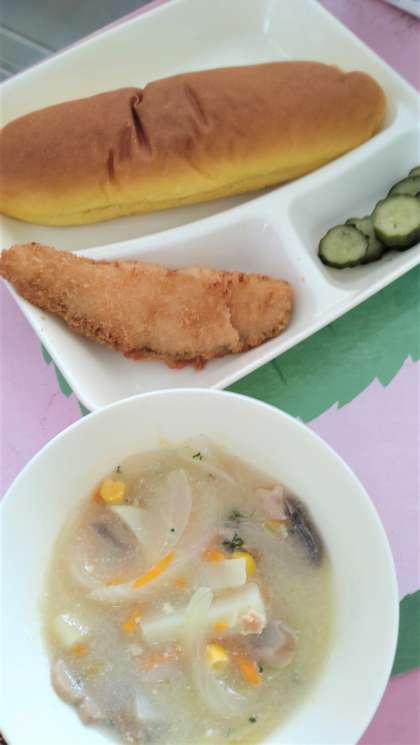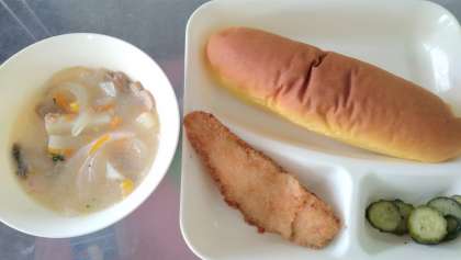 今日の給食は、サーモンフライ、豆乳スープ、きゅうりのバジル風味サラダ、パンプキンパン、牛乳です。