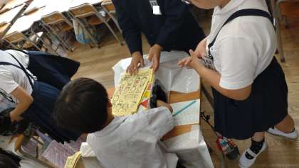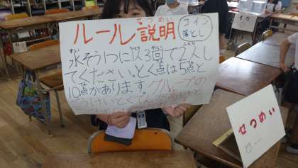 各学年・学級でいろいろと工夫してお店を開店しています。写真は、コイン落としや箱の中身をあてるゲームを楽しんでいる子どもたちの様子です。