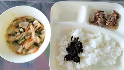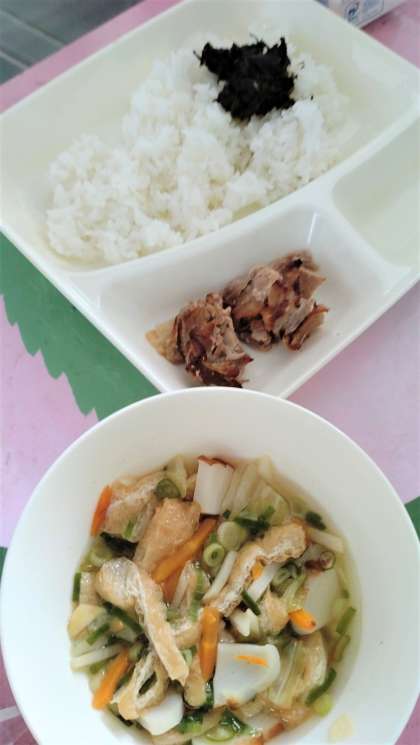 今日の給食は、豚肉の甘辛焼き、五目汁、のりのつくだ煮、ごはん、牛乳です。