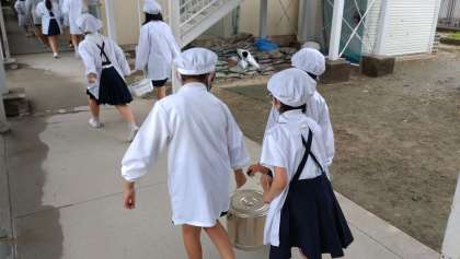 今日も各学年の給食当番が活躍しています。写真は、上段から1年生、3年生の「いただきます」のあいさつと食缶などを運んでいる様子です。