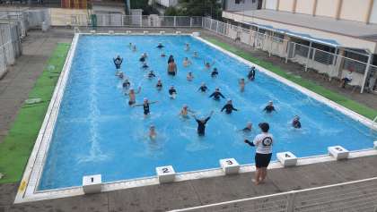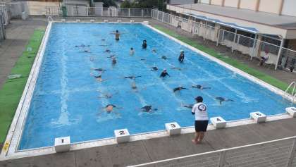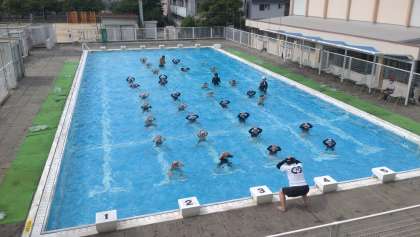 3年2組のプール開きがありました。本日は、この時間は、絶好のプール日和となりました。写真は、丁寧に水慣れをする子どもたちの様子です。