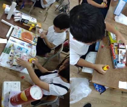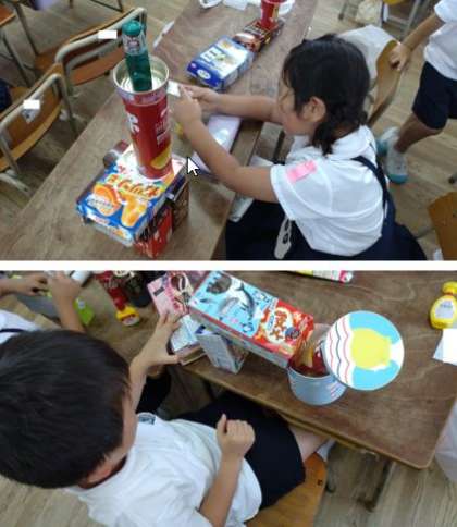 1年生が、図画工作で立体工作に取り組んでいます。いろいろな大きさや形のちがう箱を使って、動物や乗り物などを創作しています。