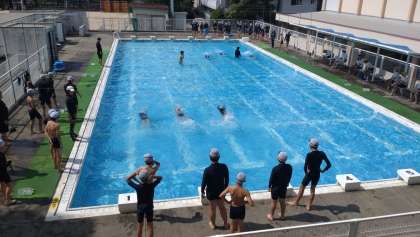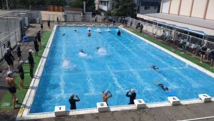 本日、1限目は、6年1・2組のプール水泳がありました。写真は、25メートルをクロールで泳いでいる子どもたちの様子です。