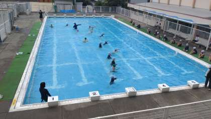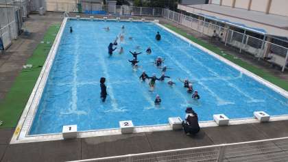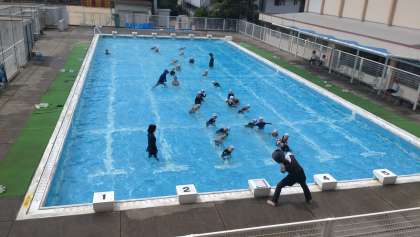 2限目は、1年1組のプールでした。今日も元気いっぱいに水の中を移動する運動遊びに取り組んでいました。