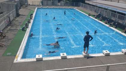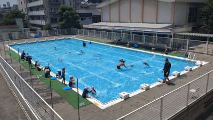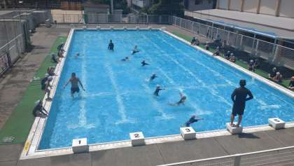 3限目に2年1組のプールがありました。ビート板につかまり、全身の力を抜いて浮くことやけのび、バタ足などの水泳運動に取り組んでいます。