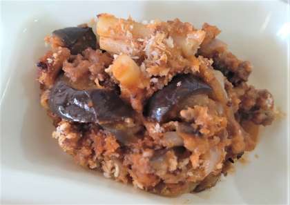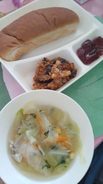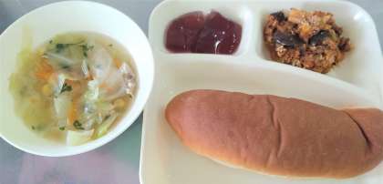 今日の給食は、なすのミートグラタン、スープ、ダイスゼリー(ぶどう)、黒糖パン、牛乳です。