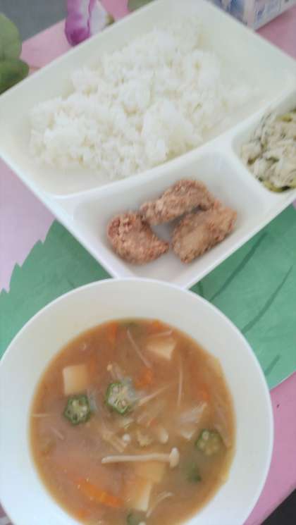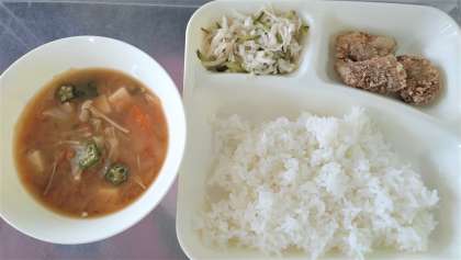 今日の給食は、豚肉のたつたあげ、みそ汁、切干しだいこんのゆずの香あえ、ごはん、牛乳です。