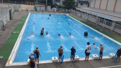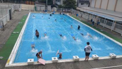 5限目は、3年2組のプールでした。プールの25メートルをビート版を使ってバタ足の練習に取り組んでいます。