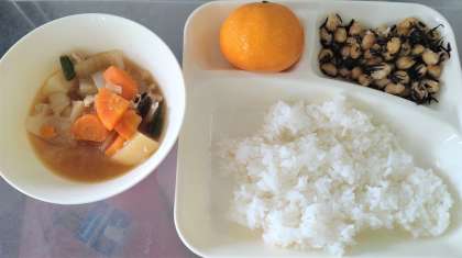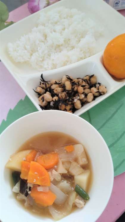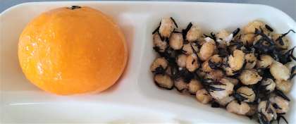 今日の給食は、鶏肉と野菜の煮もの、ひじき豆、みかん(冷)、ごはん、牛乳です。