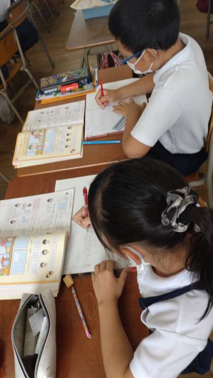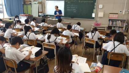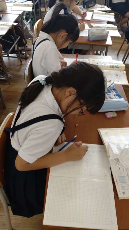 4年生が「小数」の学習に取り組んでいます。「小数の表し方」の学習で、0.1L より小さなかさの表し方を考えています。