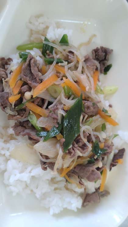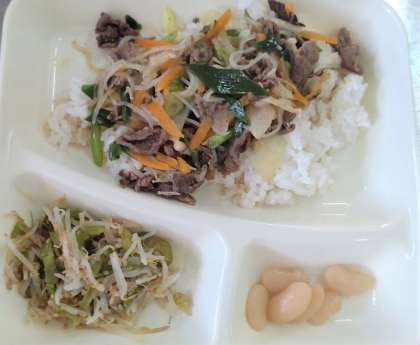 今日の給食は、牛丼、もやしとピーマンのごまいため、大福豆の煮もの、牛乳です。