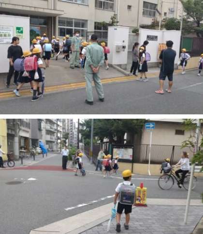 7月13日(木)、個人懇談が、本日、13日(木)、明日14日(金)に13時45分から16時30分におこなわれます。児童は全学年、給食終了後下校となります。懇談を予定されている保護者の皆様には、ご予定をよろしくお願いします。写真は、各地域で子どもたちを見守っていただいている子ども見守り隊、PTAの方々の様子です。子どもたちも元気に登校しています。