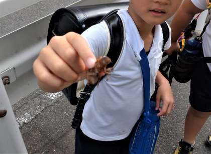 7月14日(金)、本日は、期末個人懇談(13:45-16:30)の最終日となります。よろしくお願いします。給食終了後に児童は下校します。今日も暑い1日になりますが、見守り隊の方々の見守りの下、子どもたちは元気に登校しています。下段の写真は、子どもたちがセミの抜け殻を見つけたことを伝えに来てくれた時の様子です。