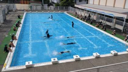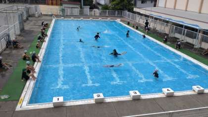 2限目は、3年1組のプールでした。中学年は、「浮いて進む運動」「もぐる・浮く運動」の水泳運動に取り組んでいます。写真は、プールの横を使って、けのび、伏し浮き、バタ足の練習をしている様子です。