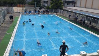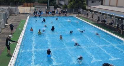 4限目は、4年1、2組のプールがありました。自分の課題に向けて水泳運動に取り組んでいます。写真は、プールのたて(25メートル)をビート板なども使いながらクロールで泳いでいる様子です。