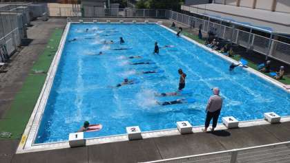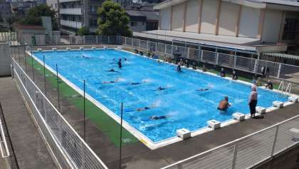 3限目に3年2組のプールがありました。ビート板を使ってバタ足の練習に取り組んでいます。子どもたちは、とても熱心に練習しています。