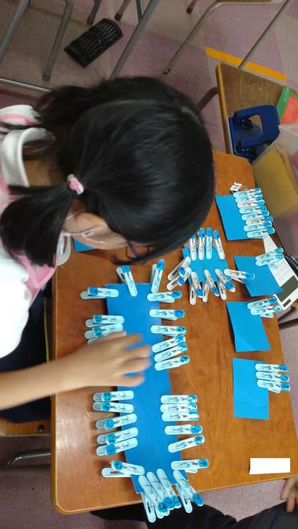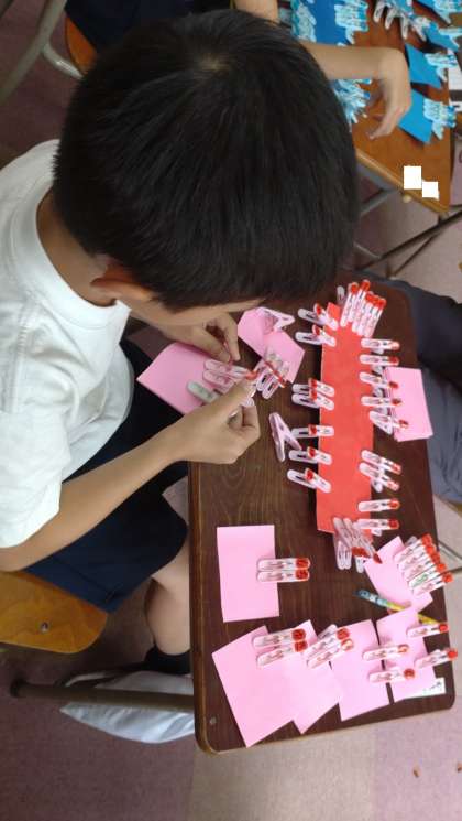 ことばあつめの学習をしました。洗濯ばさみを使った手作り教材で、身の回りから言葉を集めています。