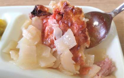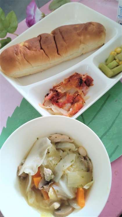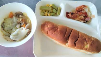今日は1学期最後の給食です。今日の給食は、鶏肉とてぼ豆のスープ煮、じゃがいもとトマトのチーズ焼き、おさつパン、牛乳です。