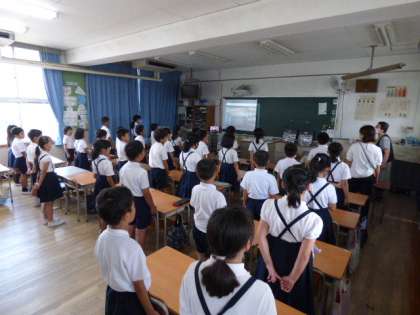 本日は1学期の終業式でした。校長先生からは宿題が出されました。内容は2学期の始業式には元気に全員が出席することです。1学期がんばった、たてわり班活動や大リーグの大谷選手のあいさつ・会釈の講話の後、児童代表の言葉として5年生の児童2名が1学期頑張ったことや、2学期に頑張りたいことを発表しました。また、プール開放や夏休みの生活についての話も担当の先生からありました。また、最後には校歌を斉唱しました。