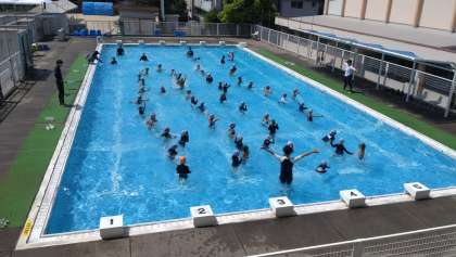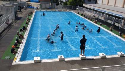 写真は、1・2年生のプール開放と3年〜6年生の図書館開放の様子です。図書館開放では、PTAの方々の支援の下、子どもたちが熱心に夏休みの宿題や読書活動に取り組んでいます。